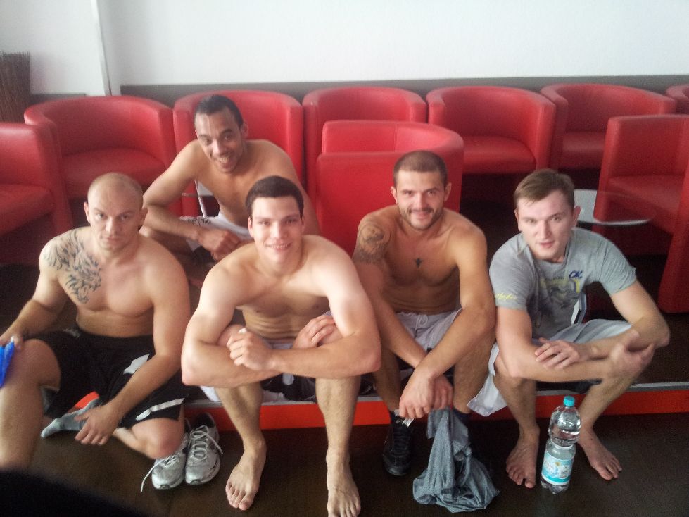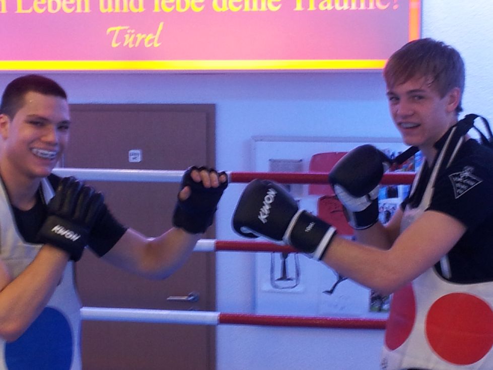 Matthias und Noel, unsere beiden Granaten :-) 13.06.2012 Joggen und Sparring jeden Sonntag um 15.00 UhrWir waren letzten Sonntag joggen und wollten anschließend noch Sparring machen. Leider war die Route etwas falsch gewählt, wir mußten etwa 2,5 Stunden bei richtig geilem Sonnenschein joggen. Als wir an der Schule ankamen, ging gar nichts mehr. Wir waren alle platt, das Sparring haben wir uns gespart, leider :-( . Versprochen, am nächsten Sonntag wird die Route besser und natürlich kürzer, so daß wir auch anschließend Sparring machen können. Jeder ist recht herzlich eingeladen, so wie Ihr möchtet könnt Ihr nur Joggen oder auch Sparring machen. Hier noch ein Bild nach dem Joggen :-)